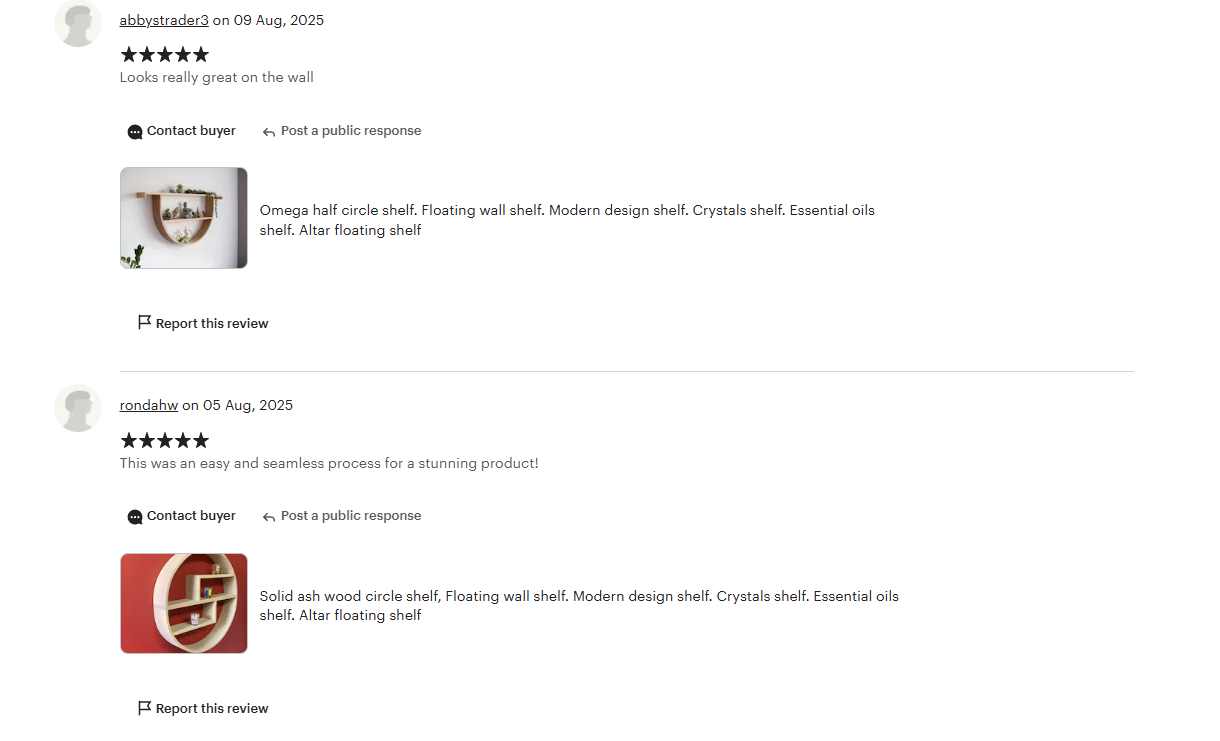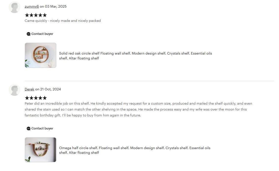 Peter did an incredible job on this shelf. He kindly accepted my request for a custom size, produced and mailed the shelf quickly, and even shared the stain used so I can match the other shelving in the space.